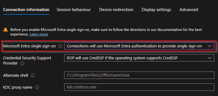 - Now we need to adjust our hostpool in Azure Virtual Desktop to make the authentication work. Go to the Azure Virtual Desktop backplane in Azure to open the hostpool settings. Go to RDP Properties to change the settings at the Connection information tab. Here you can select: Connections will use Microsoft Entra authentication to provide single sign-on.