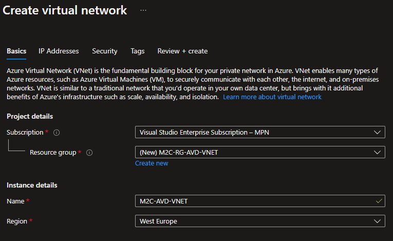 • Resource group: M2C-RG-AVD-VNET