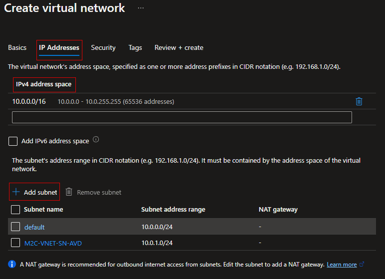 • Subnet name: In this example, we named the subnet “M2C-VNET-SN-AVD“.