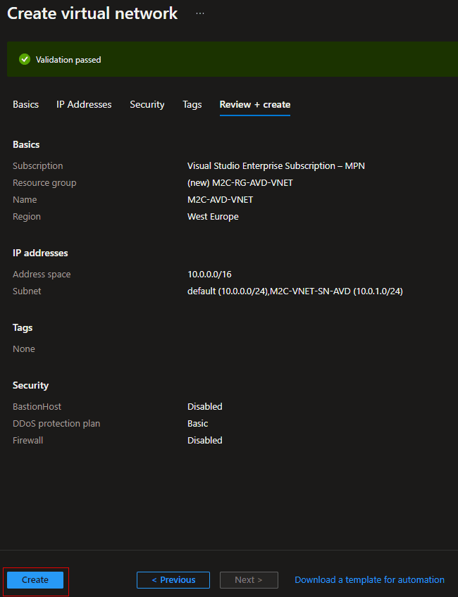 1. After the settings have been validated, select Create to create the virtual network.