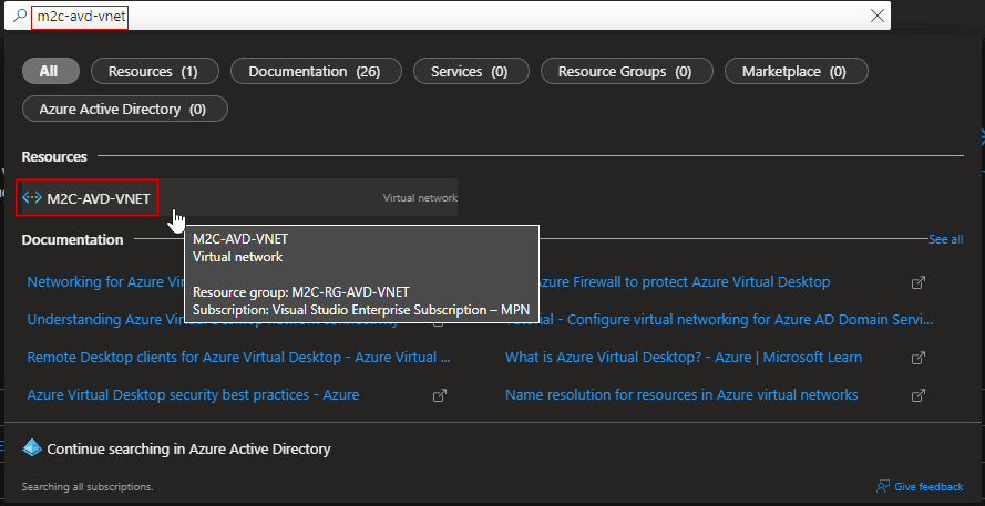 1. In the search box at the top of the Azure portal. look for “M2C-AVD-VNET” (your created VNET). It will appear in the search results, select it.