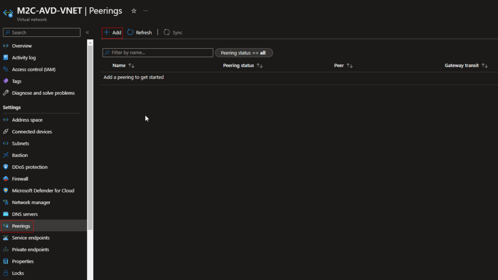 1. Under Settings, select Peerings, and then select + Add, as shown in the following picture: