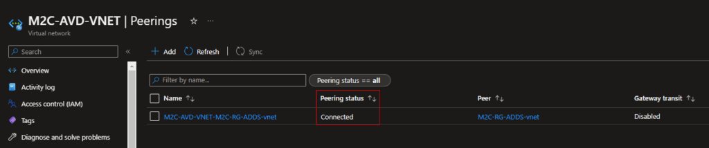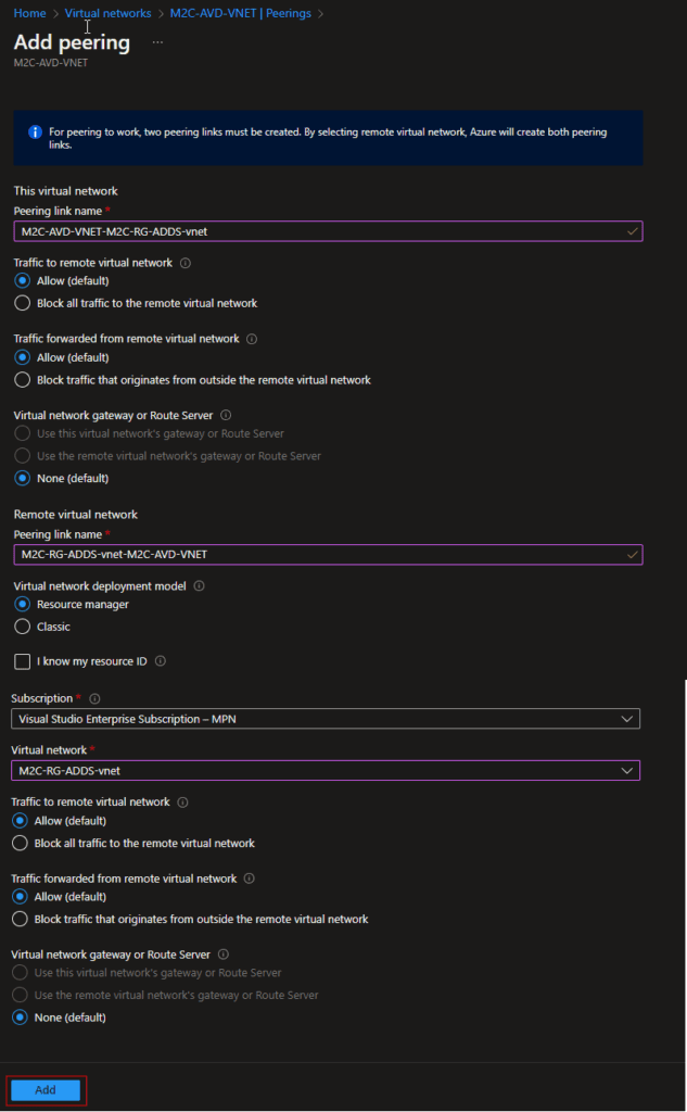 Peering link nameEnter M2C-RG-ADDS-vnet-M2C-AVD-VNET for the name of the peering from the remote virtual network to M2C-AVD-VNET.