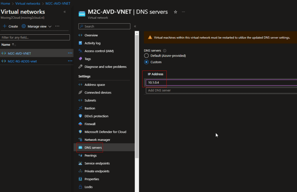 1. Now that the VNET peering is connected, please ensure you have set the DNS servers to the right ip adresses. Because the hostpool needs to resolve the domainname from your Active Directory. Check the following image.