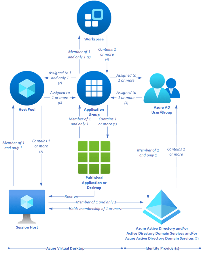 Here is the overview of all the resources from the backplane of the Azure Virtual Desktop environment. The following drawing is from the Microsoft Learning website.