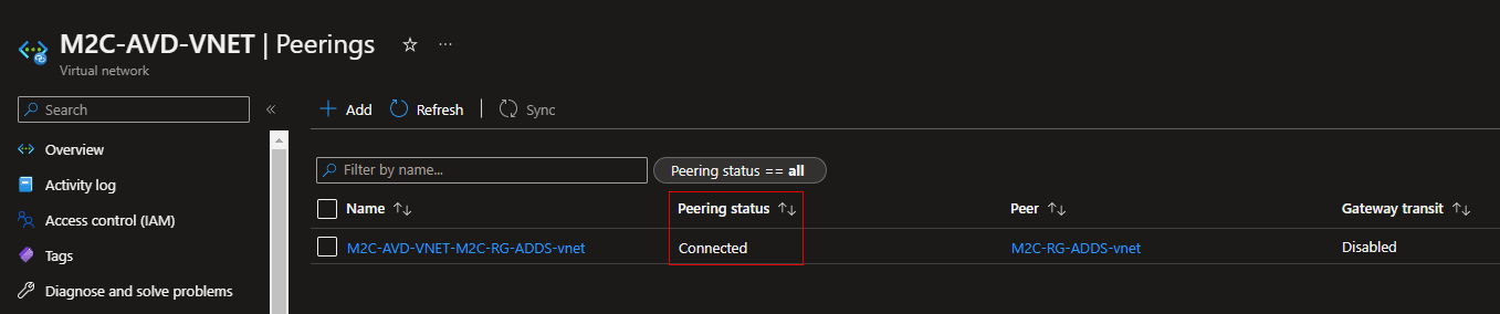Peering link nameEnter M2C-RG-ADDS-vnet-M2C-AVD-VNET for the name of the peering from the remote virtual network to M2C-AVD-VNET.